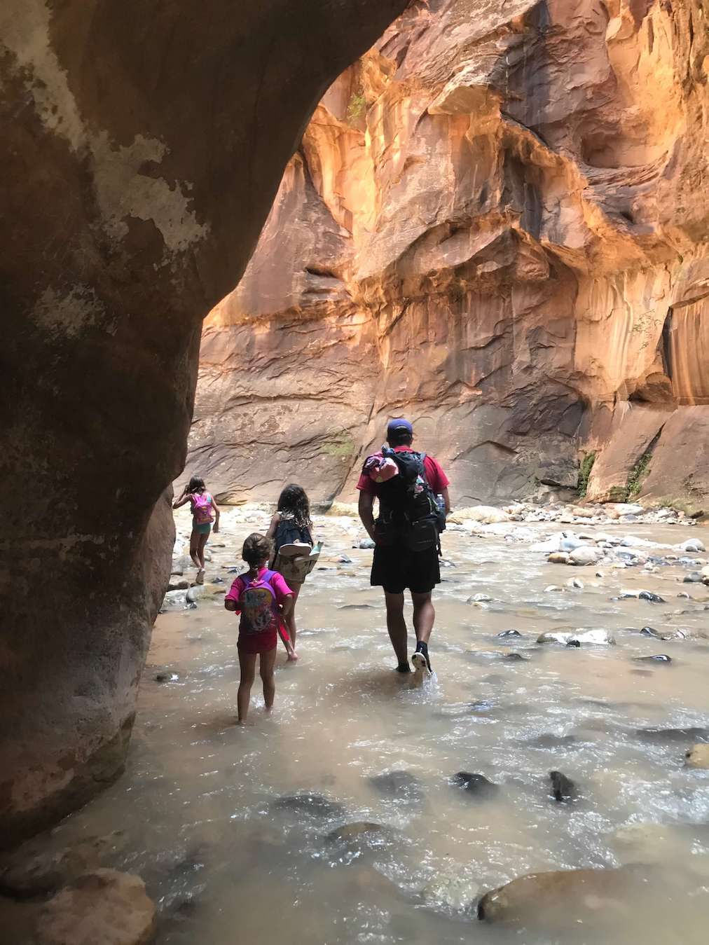 Start your first day super early at the Zion National Park Visitor Center near Springdale. Hop on the first bus of the morning and take it all the way to the last stop, Riverside Walk Trailhead. This path will lead you to the famous Narrows, a winding slot canyon 16 miles long. Unless you are an extreme hiker with a permit you will not be doing the whole thing, just a portion of the lower section until you turn back. We recommend bringing water shoes in your dry pack, and a lunch, that way you aren’t walking in wet shoes the rest of the day. Stop for lunch on your own private stretch of sand and enjoy the cool water of the Virgin River on your toes. The Narrows may be the only hike you do this day, depending on how far you go, and that is fine. We travelled with kids so we didn’t make it too far before heading back through the National Park and stopping at other points of interest along the way. Some of our favorite stops were hiking up Weeping Rock, the Grotto, and the Emerald Pools. We also took some time to stop at the Zion National Park Lodge for ice cream and just to lounge in the grass for a rest. The other bonus of taking the National Park bus is the narrated tour that teaches you about the history and geological area you are looking at.