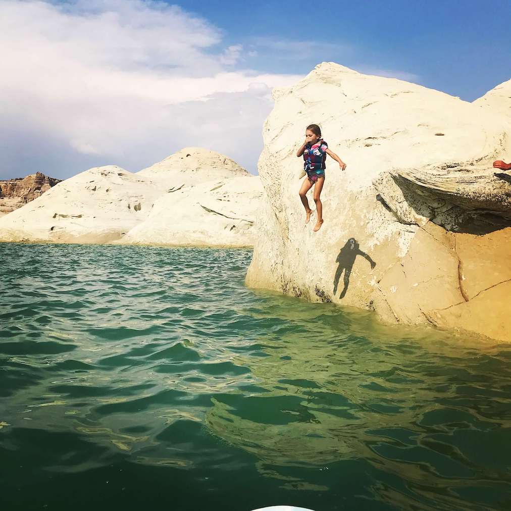 We love Antelope Canyon, but access can be tricky to visit depending on the recent rainfall. One year, we were able to stand up paddle board right from Antelope Marina around to the slot canyon, about a mile to the base of Antelope Canyon hike. We hiked for less than a mile in this crazy sandstone slot canyon, although it went on for several more miles after that. Another year, the lake was so low we couldn’t access this area at all from the water, and would have been better off taking a tour down into the canyon from the top. This is a much more touristy option, but if you really want the experience it may be your only choice. Hopefully, you can take the water route, which is solitary and relaxing, and you can even stop to cliff jump, or take a nap if your mom is paddling for you. We recommend starting this adventure early in the morning as the area is known to get busy and hot.