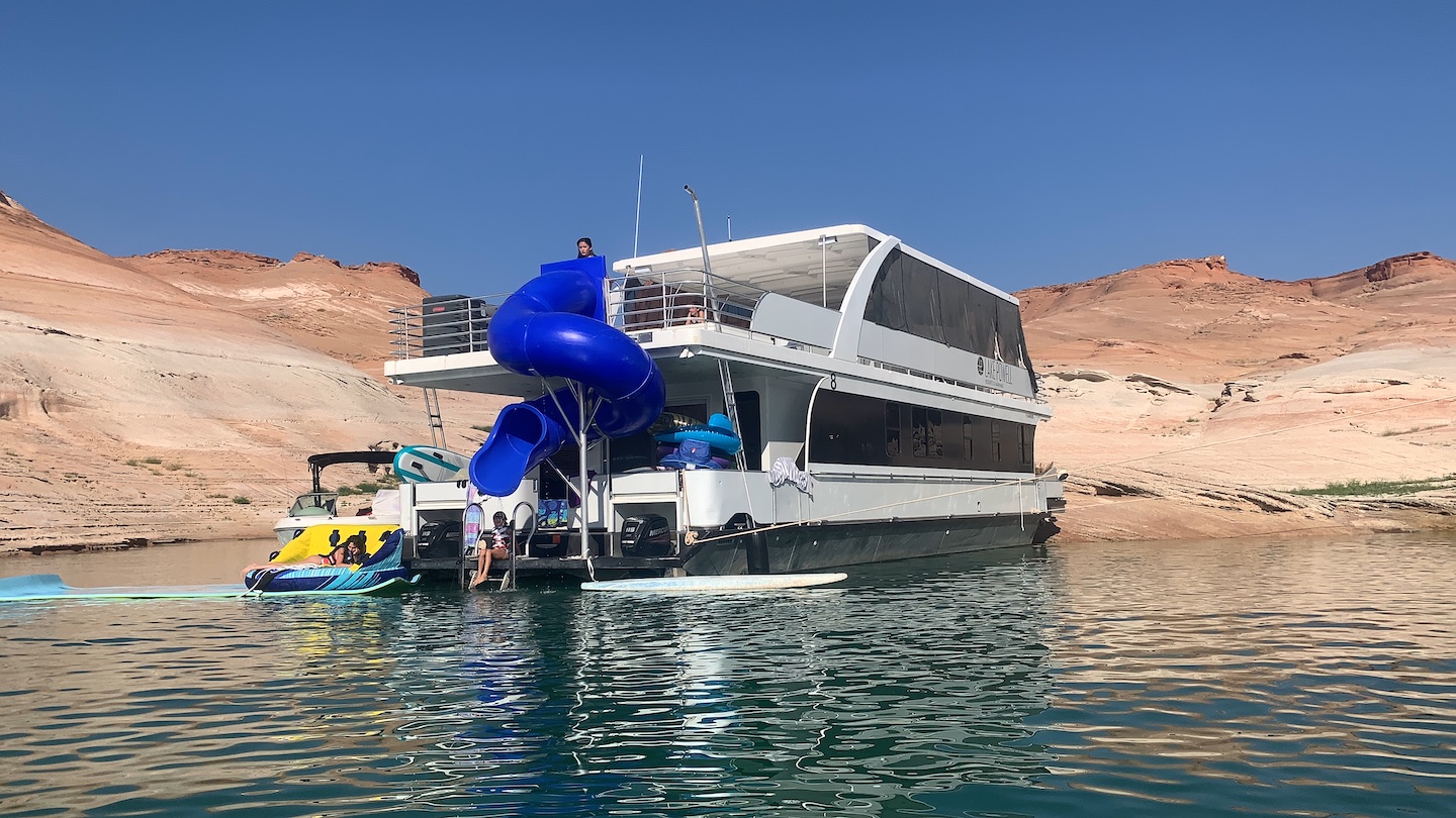- Go with someone that has experience on Lake Powell specifically, or someone with significant nautical knowledge. Lake Powell can be incredibly dangerous because the weather is unpredictable in the high desert, and you will be very isolated once you get out on the lake. Remember you will be several hours from any emergency help at all times, so you need to be able to handle most situations on your own. In addition, driving a houseboat is like driving a floating RV, but twice as tall, twice as wide, and three times as long. It doesn’t turn well, the power is run off a gas generator, and they only hold so much water and fuel. If you or your party has never driven a houseboat before, I highly recommend asking the employees at the marina to drive it out to open water, and back in to the dock when you return. These are the two most common places for a boat accident and can be easily avoided by asking a professional for help.