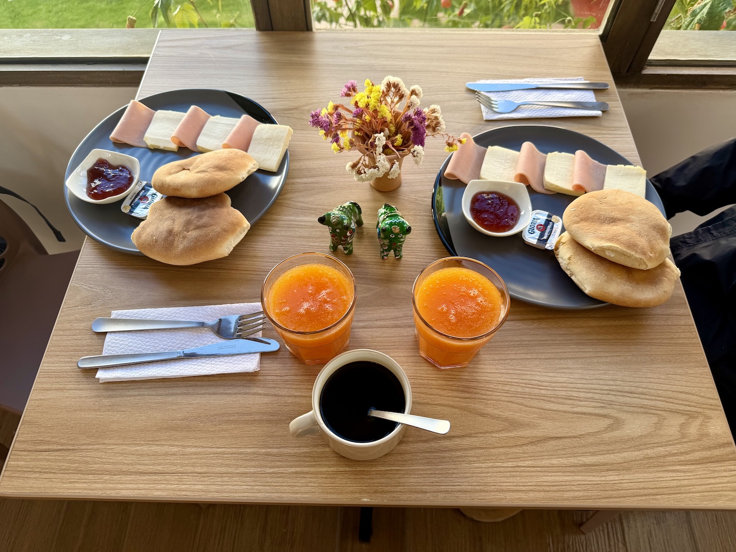 The accommodations are decorated with warm woods and colorful textured fabrics that give a retreat feel to each space. We loved our clean, well stocked room, complete with a queen bed and a desk. The beds were comfortable and the showers were hot with excellent water pressure. The dining area and office room on site provide a well-lit space for a relaxing meal or a quiet place to work.
