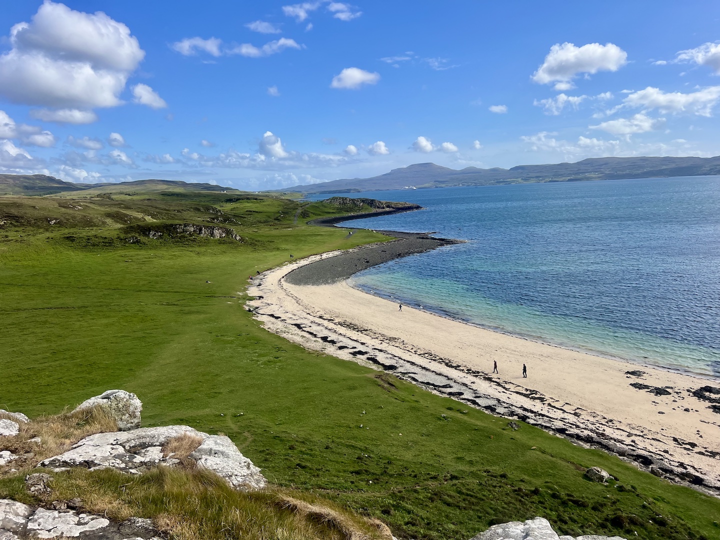 On your first full day, take the scenic loop north on A855 from Portree, picking some points of interest along the way. We chose to stop at Old Man of Storr first, but it was rammed with tourists and we chose not to hike there. Next we visited Kilt Rock for the stunning viewpoint (in the beautiful sunshine) and then hunted for Dinosaur footprints at An Corran Beach a few minutes later (where it poured on us). From there we crossed through the Quiraing, and chose to take a nature walk at the Fairy Glen (in perfect weather again). You can stop at Skye Brewery or get lunch in Uig along the way, or bring a picnic lunch with you. Just be sure to pack layers and plan to experience every season multiple times throughout the day.