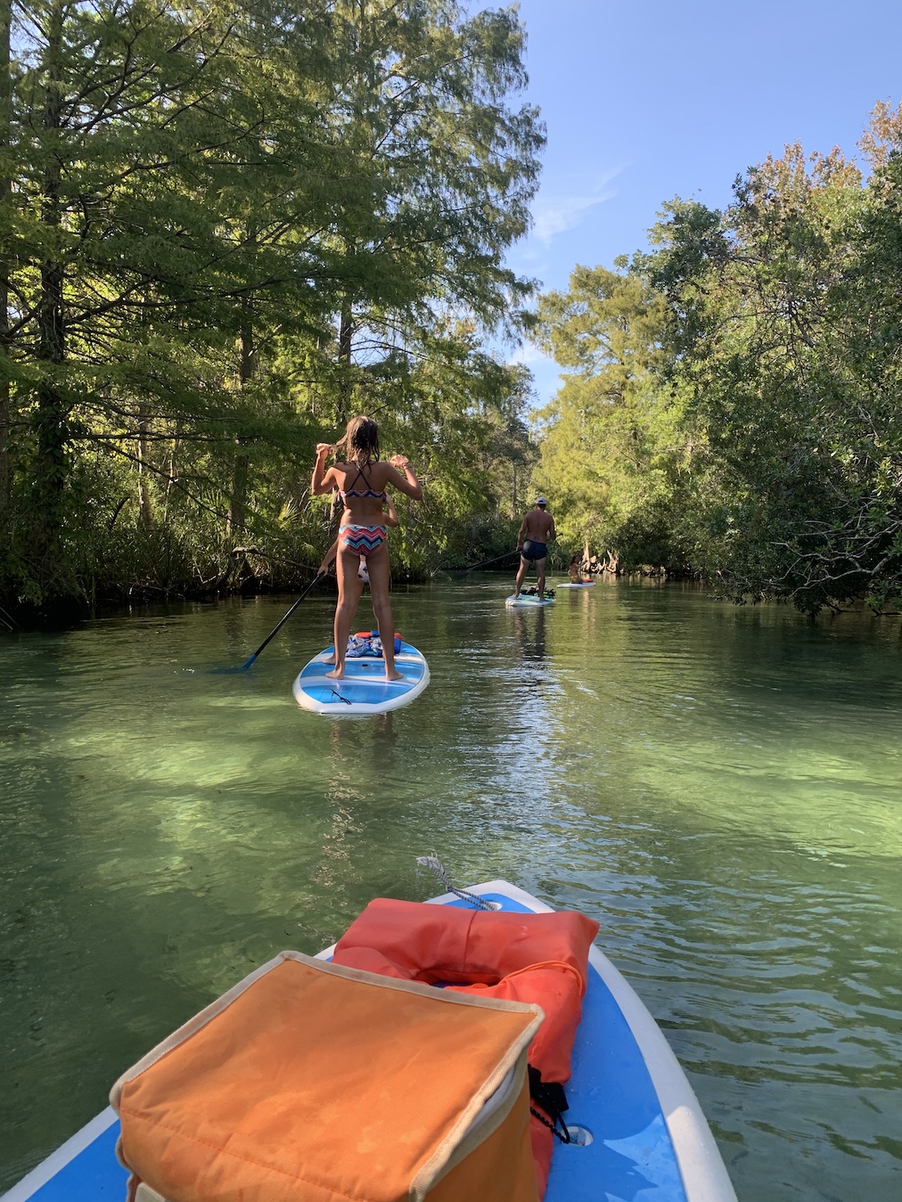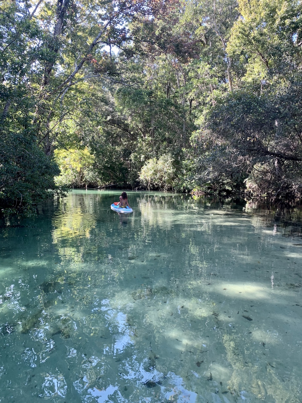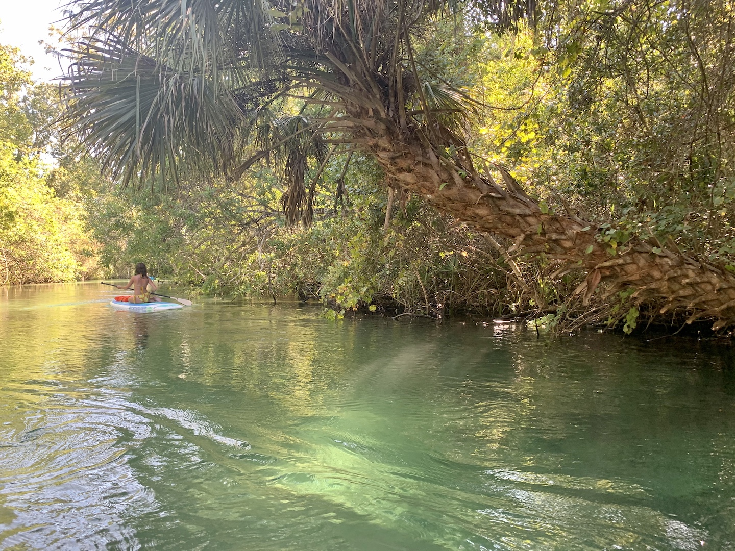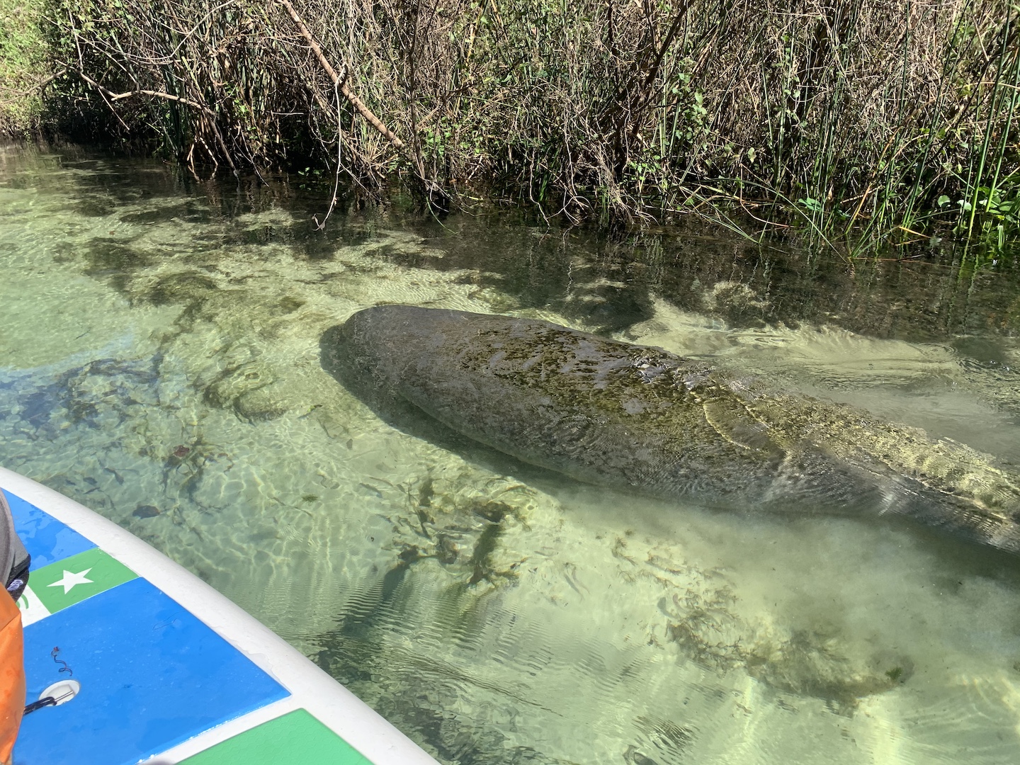 We rented stand up paddle boards from supweeki (supweeki.com), and they were a joy to work with. The owners took us out on the river with them, taught us about the Manatees, and let us go off exploring. The river was stunning. Crystal clear waters cocooned by tunnels of lush vegetation, tall palms, and few houses dotting the banks. There were areas of crowds with boats and river toys gathering to play and barbecue on the sandbanks, but there were far more areas of peaceful solitude. After about an hour paddling up river and enjoying the scenery, we were graced with our first glimpse of a Manatee in the wild. They are quite agile for their size and reputation, swimming upside down, rolling, and generally moving quickly, so it was hard to keep up with them! Thankfully, there were several sets of Manatees seeking out the cool, refreshing fresh water of the spring, so we got to take our time enjoying them.